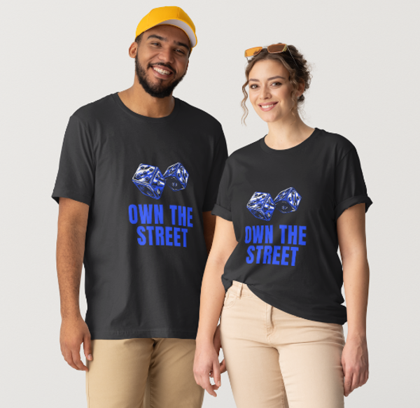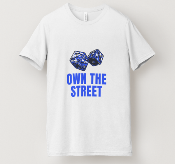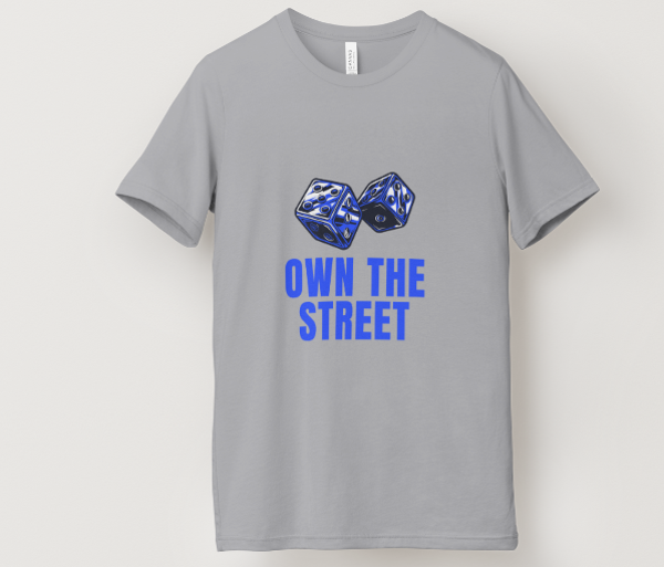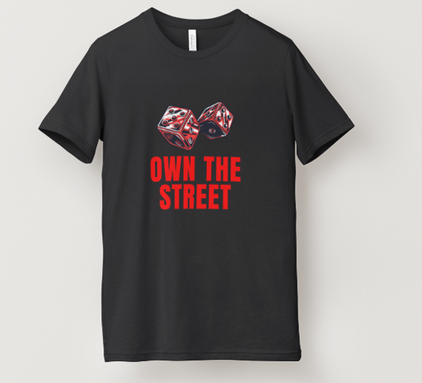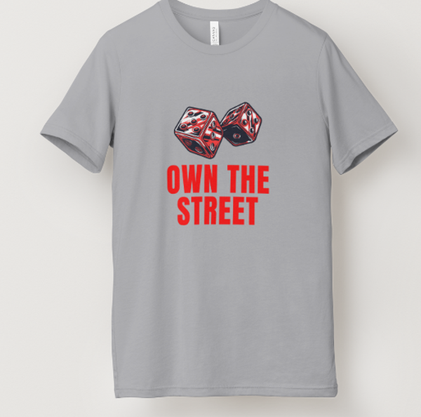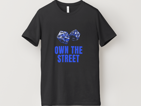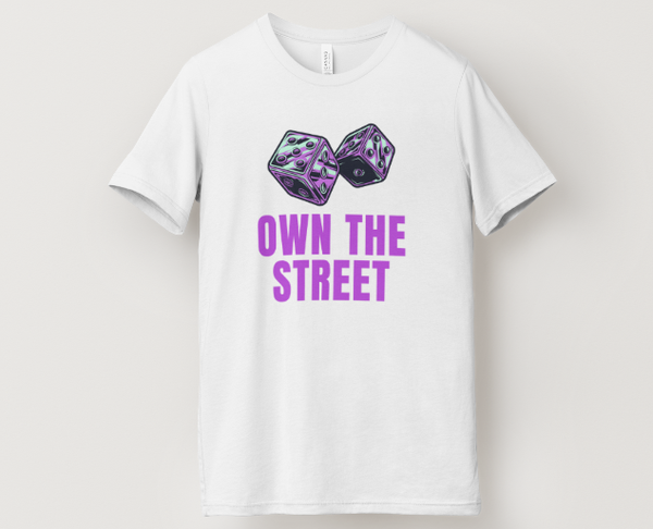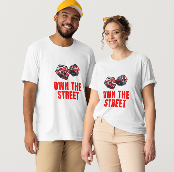 Roll with confidence in our "Own the Street" graphic tee. Featuring bold typography and a pair of detailed dice, this shirt makes a statement wherever you go. Perfect for streetwear lovers and risk-takers alike, it combines edgy design with everyday comfort.